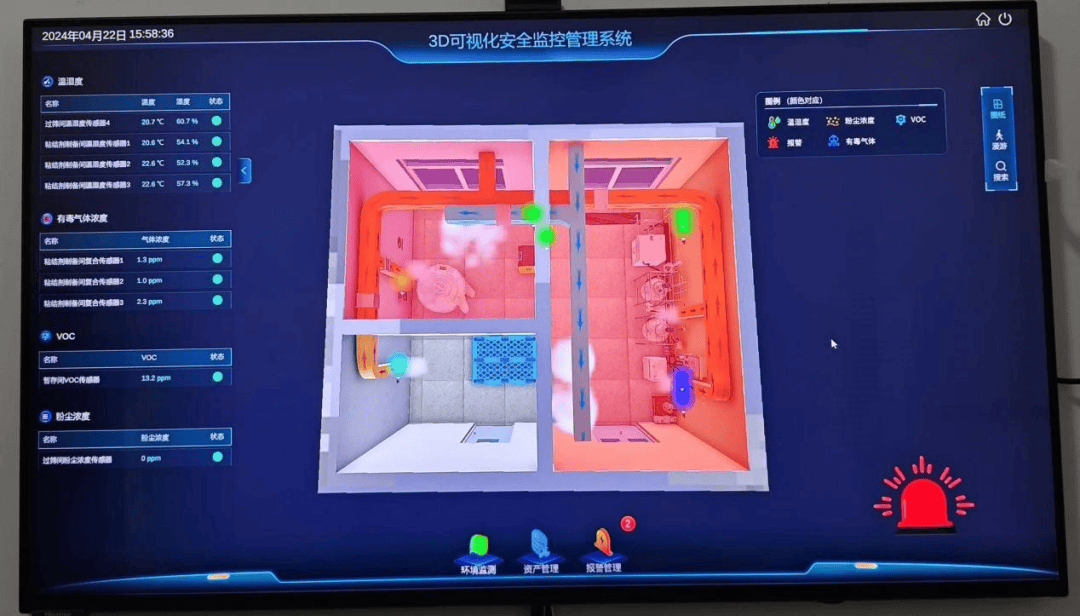 针对工作场所尘毒等职业病危害因素治理和同时维持场所温湿度稳定的难题,构建具备稳定感知、智能预警、环境动态微平衡、三维全局监控的防护体系,形成“可靠感知→智能预测→精准治理/环境平衡→直观决策”的闭环,实现尘毒治理从被动应对到主动预防的根本转变,适用于化工、建材、钢铁、有色等行业中尘毒危害的治理。