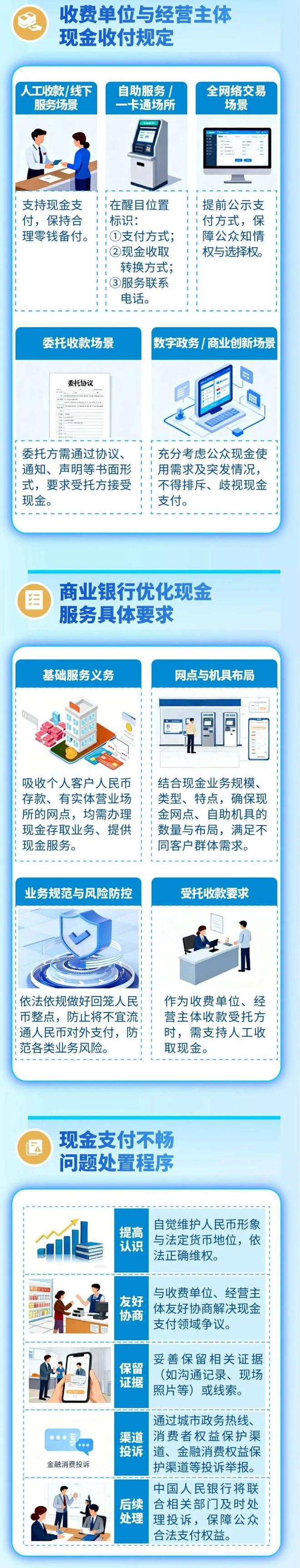 查看),自2026年2月1日起施行。采取人工方式收款、提供面对面服务以及线上预约、交易,线下完成服务或货物交付,具备当面收款条件的,收费单位、经营主体应支持现金支付,保持合理的零钱备付。采取无人值守、机具设备等自助服务模式,以及采用“一卡通”结算、进行统一管理的园区、厂区、景区、学校等场所,经营主体应在醒目位置标识支付方式、现金收取转换方式及服务联系电话。采取转换手段收取现金,不得收取手续费或设置限制条件,造成转换不便。