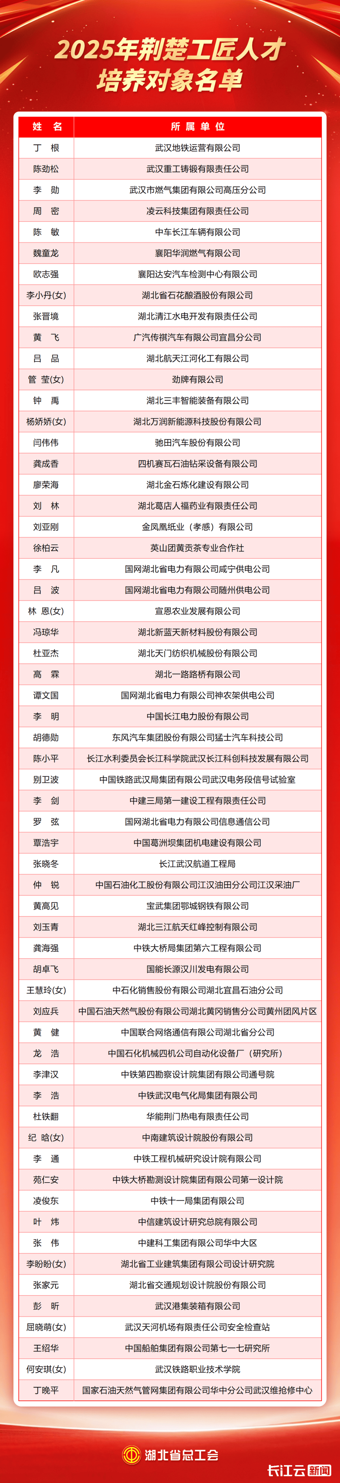 ●近日,湖北省总工会印发《关于公布2025年荆楚工匠人才培养对象并开展培养工作的通知》,公布2025年荆楚工匠人才培养对象名单,对培养工作进行系统部署。